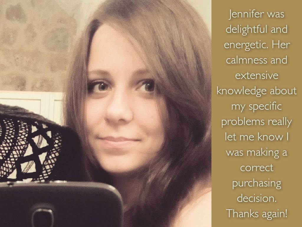Jennifer was delightful and energetic. Her calmness and extensive knowledge about my specific problems really let me know I was making a correct purchasing decision.