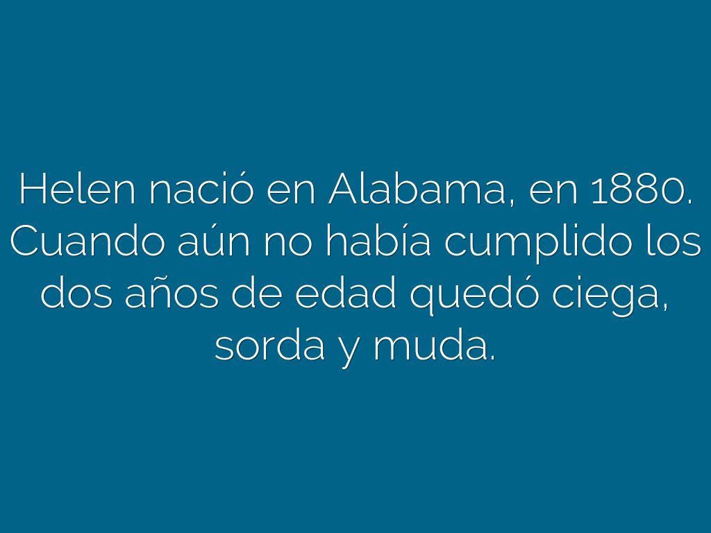 Helen nació en Alabama, en 1880. Cuando aún no había cumplido los dos años de edad quedó ciega, sorda y muda.