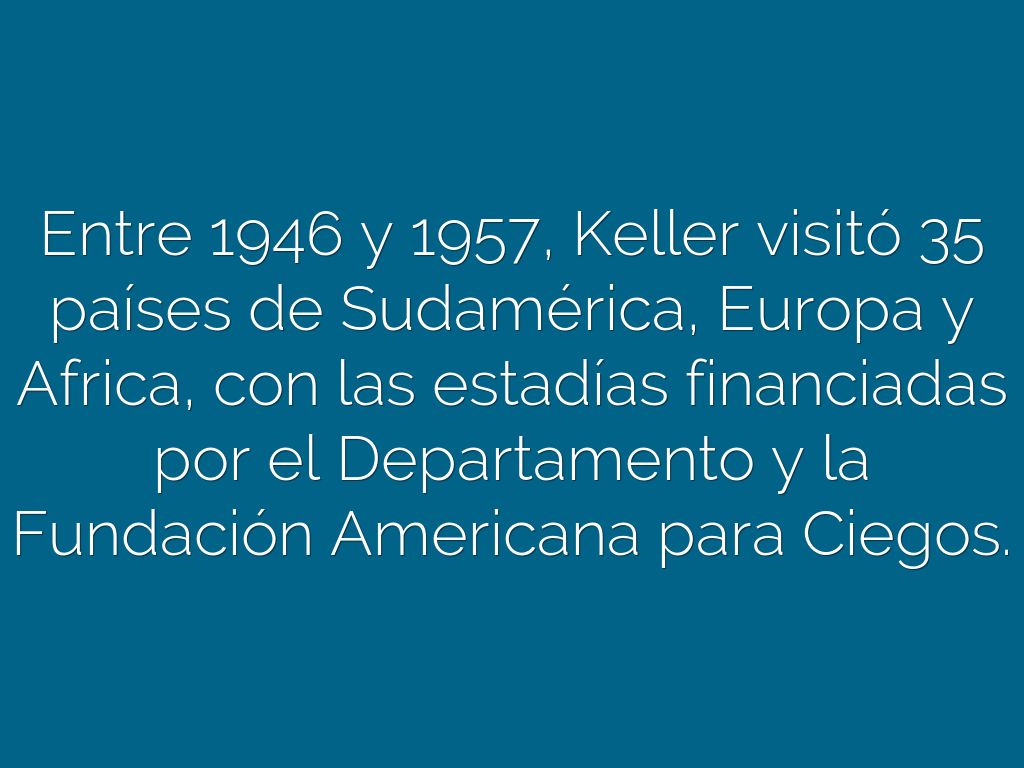 Entre 1946 y 1957, Keller visitó 35 países de Sudamérica, Europa y Africa, con las estadías financiadas por el Departamento y la Fundación Americana para Ciegos.