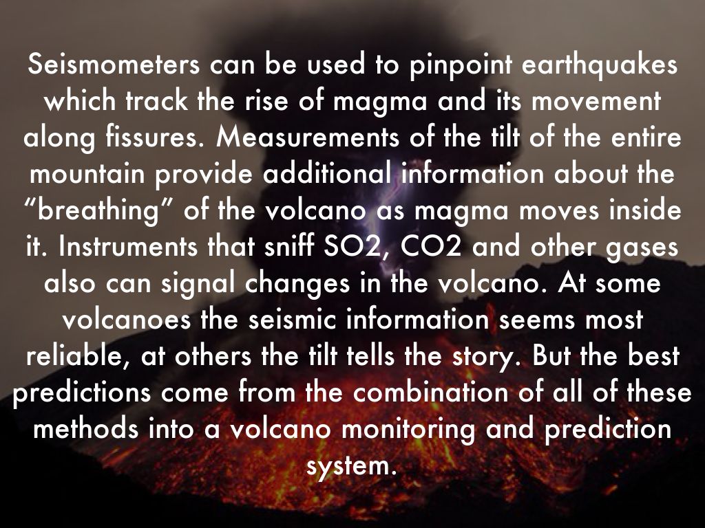 Seismometers can be used to pinpoint earthquakes which track the rise of magma and its movement along fissures. Measurements of the tilt of the entire mountain provide additional information about the “breathing” of the volcano as magma moves inside it. Instruments that sniff SO2, CO2 and other gases also can signal changes in the volcano. At some volcanoes the seismic information seems most reliable, at others the tilt tells the story. But the best predictions come from the combination of all of these methods into a volcano monitoring and prediction system.