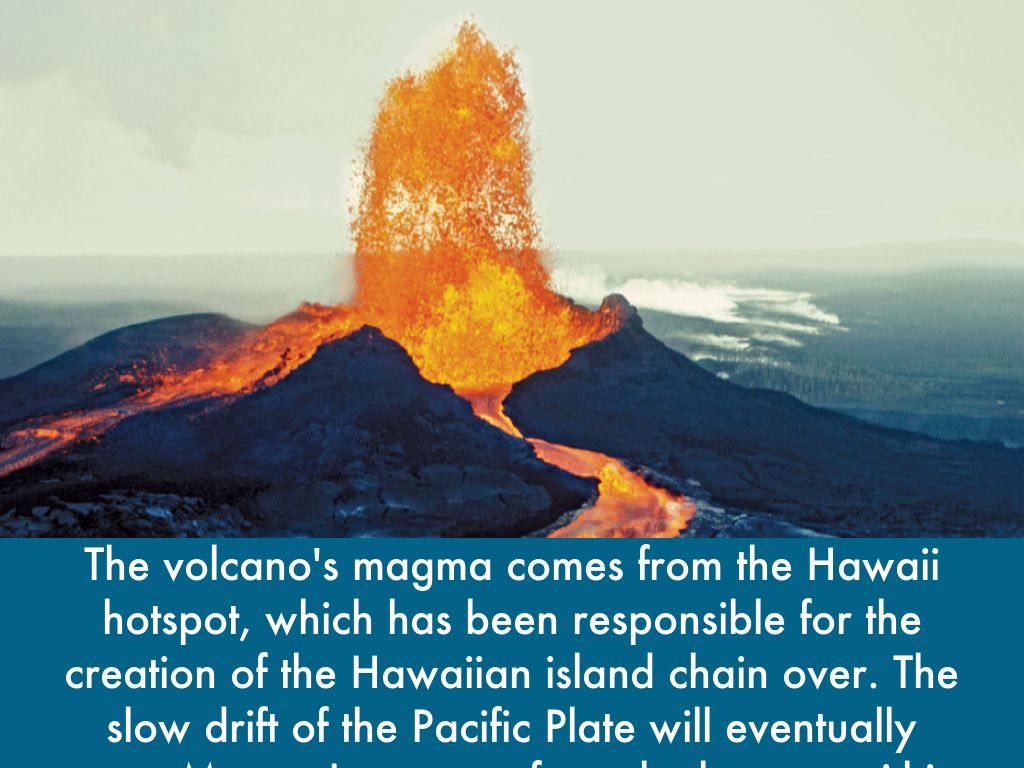 The volcano's magma comes from the Hawaii hotspot, which has been responsible for the creation of the Hawaiian island chain over. The slow drift of the Pacific Plate will eventually carry Mauna Loa away from the hotspot within 500,000 to one million years from now, at which point it will become extinct