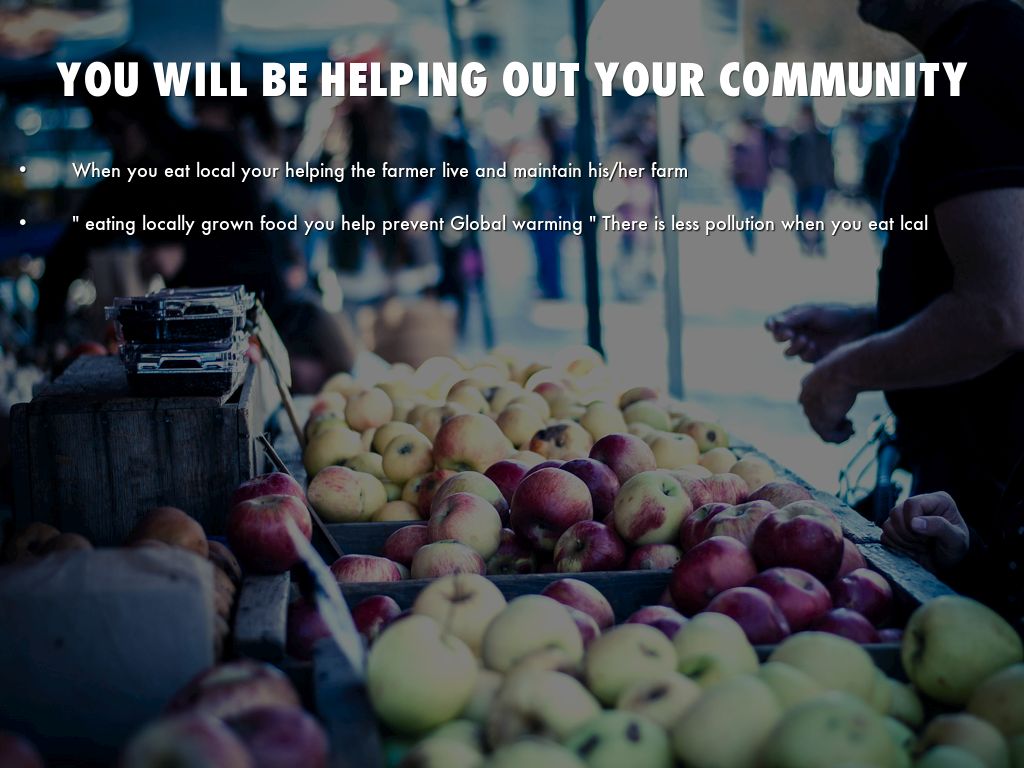 " eating locally grown food you help prevent Global warming " There is less pollution when you eat lcal
