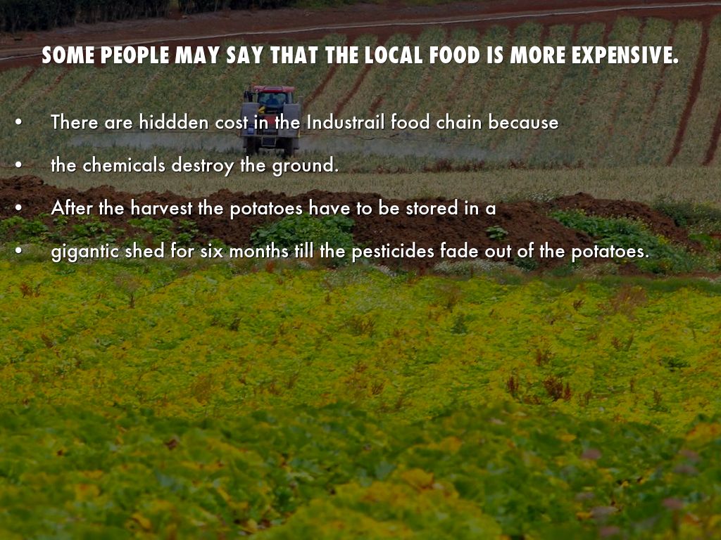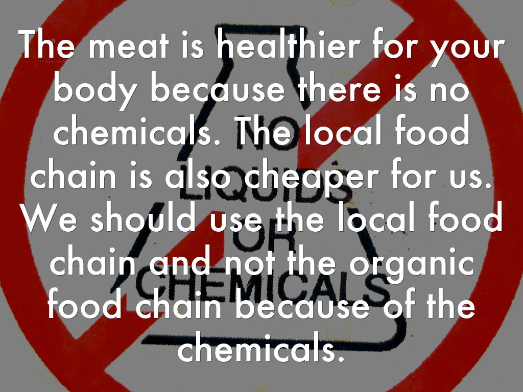The meat is healthier for your body because there is no chemicals. The local food chain is also cheaper for us. We should use the local food chain and not the organic food chain because of the chemicals.