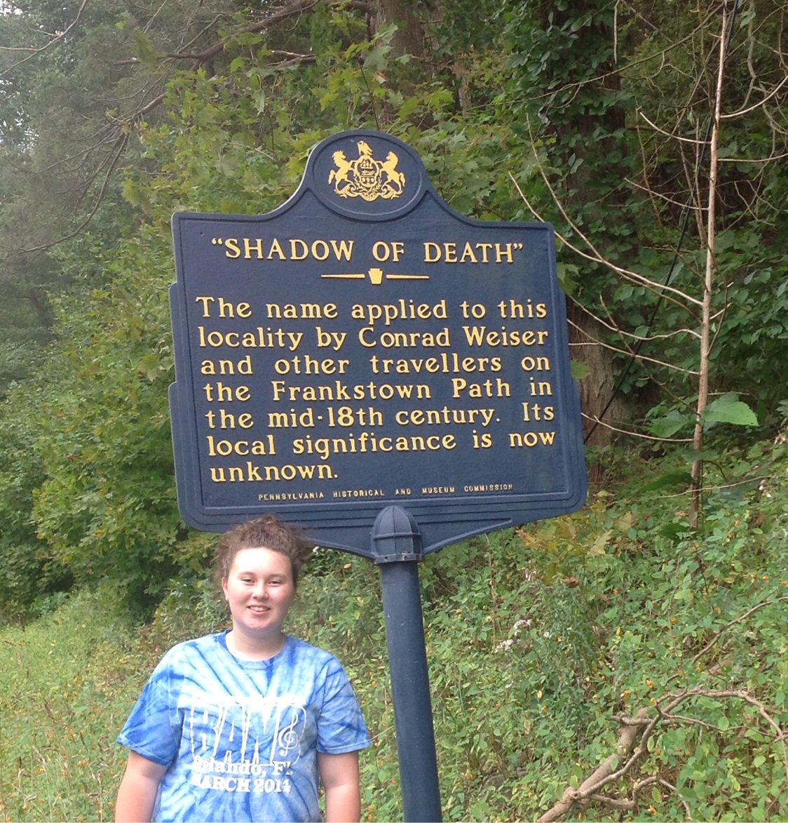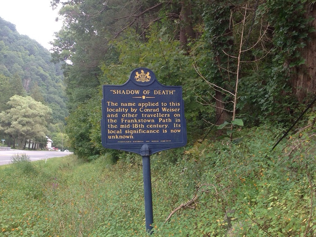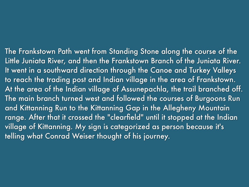 The Frankstown Path went from Standing Stone along the course of the Little Juniata River, and then the Frankstown Branch of the Juniata River. It went in a southward direction through the Canoe and Turkey Valleys to reach the trading post and Indian village in the area of Frankstown. At the area of the Indian village of Assunepachla, the trail branched off. The main branch turned west and followed the courses of Burgoons Run and Kittanning Run to the Kittanning Gap in the Allegheny Mountain range. After that it crossed the "clearfield" until it stopped at the Indian village of Kittanning. My sign is categorized as person because it's telling what Conrad Weiser thought of his journey.