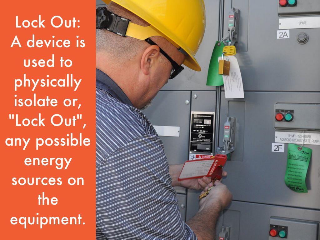 A device is used to physically isolate or, "Lock Out", any possible energy sources on the equipment.