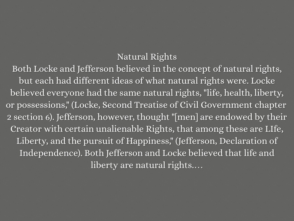 Both Locke and Jefferson believed in the concept of natural rights, but each had different ideas of what natural rights were. Locke believed everyone had the same natural rights, "life, health, liberty, or possessions," (Locke, Second Treatise of Civil Government chapter 2 section 6). Jefferson, however, thought "[men] are endowed by their Creator with certain unalienable Rights, that among these are LIfe, Liberty, and the pursuit of Happiness," (Jefferson, Declaration of Independence). Both Jefferson and Locke believed that life and liberty are natural rights.