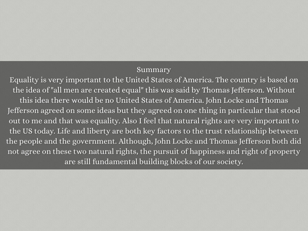 Equality is very important to the United States of America. The country is based on the idea of "all men are created equal" this was said by Thomas Jefferson. Without this idea there would be no United States of America. John Locke and Thomas Jefferson agreed on some ideas but they agreed on one thing in particular that stood out to me and that was equality. Also I feel that natural rights are very important to the US today. Life and liberty are both key factors to the trust relationship between the people and the government. Although, John Locke and Thomas Jefferson both did not agree on these two natural rights, the pursuit of happiness and right of property are still fundamental building blocks of our society.