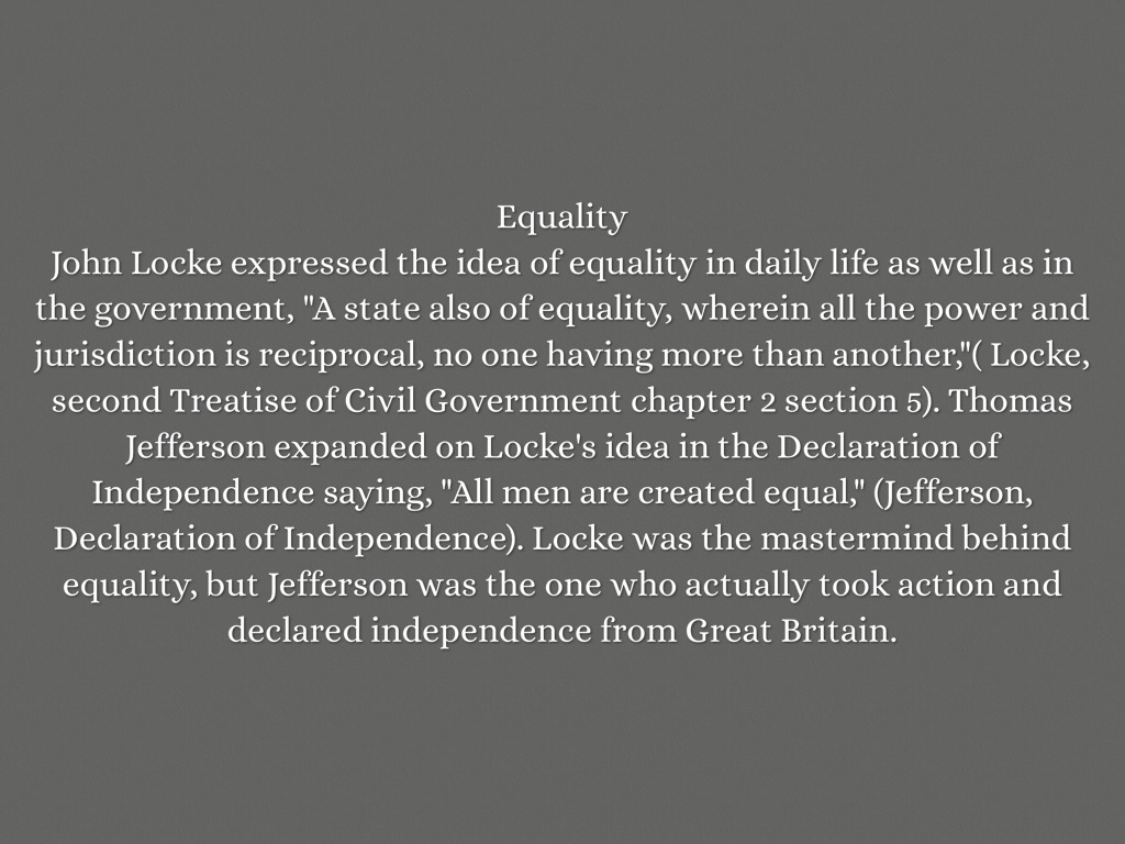 John Locke expressed the idea of equality in daily life as well as in the government, "A state also of equality, wherein all the power and jurisdiction is reciprocal, no one having more than another,"( Locke, second Treatise of Civil Government chapter 2 section 5). Thomas Jefferson expanded on Locke's idea in the Declaration of Independence saying, "All men are created equal," (Jefferson, Declaration of Independence). Locke was the mastermind behind equality, but Jefferson was the one who actually took action and declared independence from Great Britain.