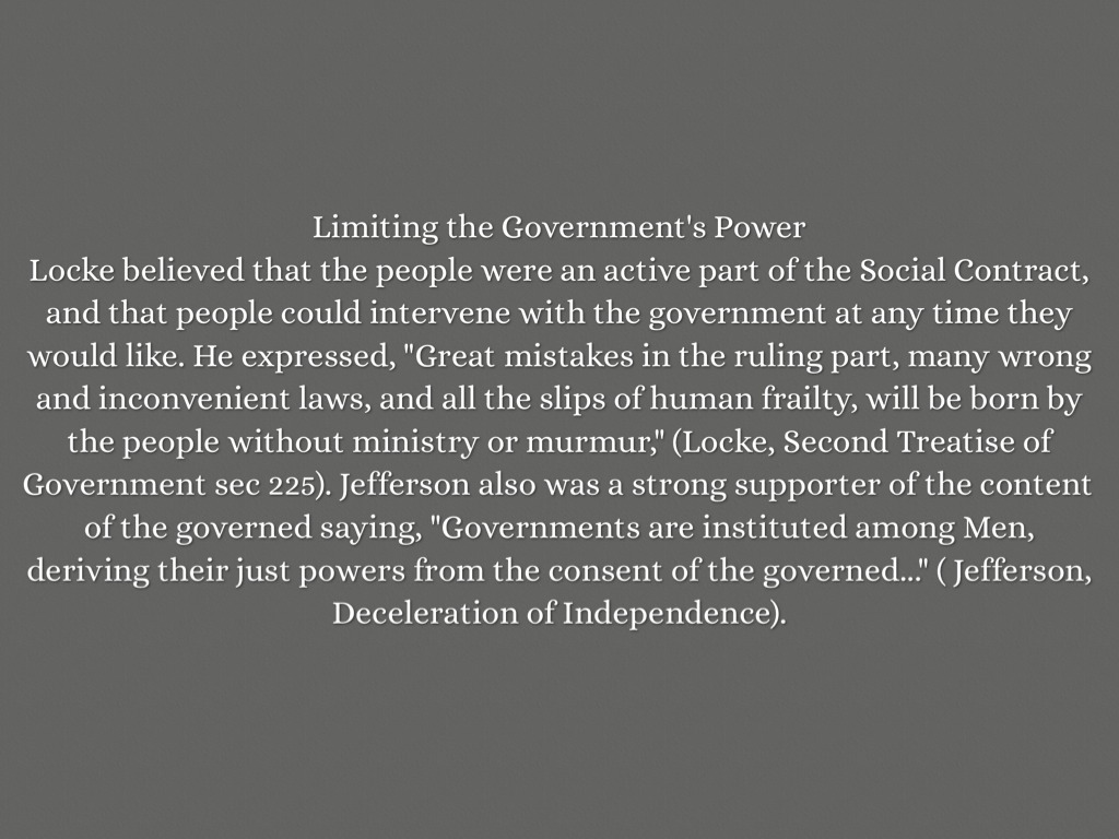 Locke believed that the people were an active part of the Social Contract, and that people could intervene with the government at any time they would like. He expressed, "Great mistakes in the ruling part, many wrong and inconvenient laws, and all the slips of human frailty, will be born by the people without ministry or murmur," (Locke, Second Treatise of Government sec 225). Jefferson also was a strong supporter of the content of the governed saying, "Governments are instituted among Men, deriving their just powers from the consent of the governed..." ( Jefferson, Deceleration of Independence).