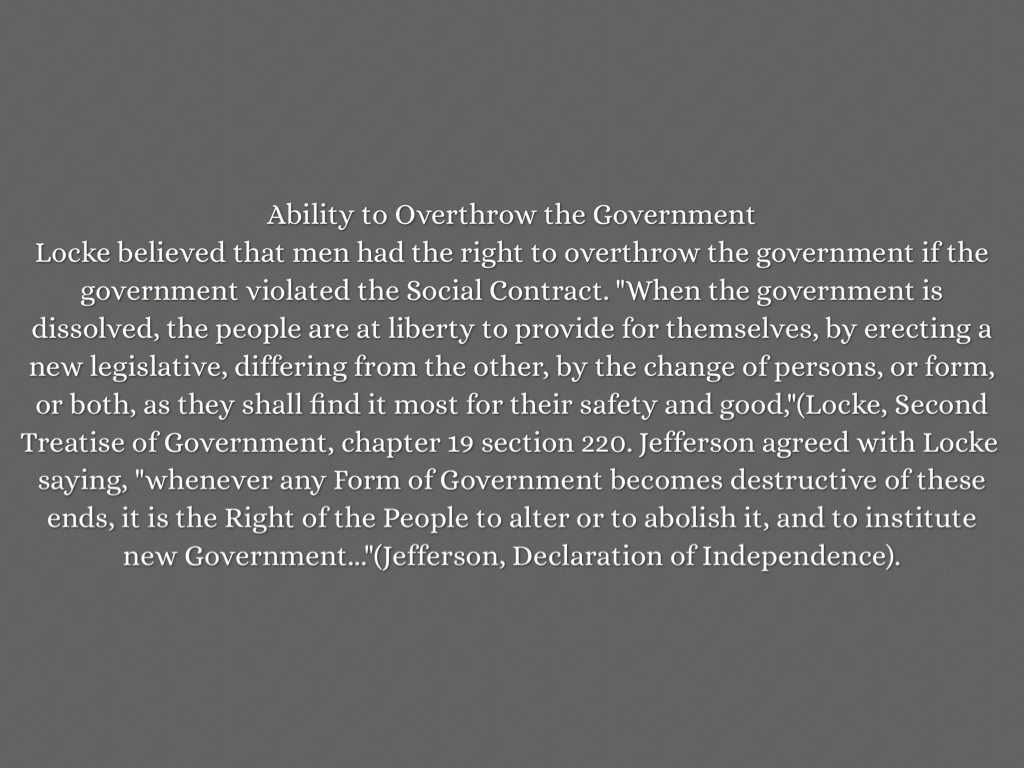 Locke believed that men had the right to overthrow the government if the government violated the Social Contract. "When the government is dissolved, the people are at liberty to provide for themselves, by erecting a new legislative, differing from the other, by the change of persons, or form, or both, as they shall find it most for their safety and good,"(Locke, Second Treatise of Government, chapter 19 section 220. Jefferson agreed with Locke saying, "whenever any Form of Government becomes destructive of these ends, it is the Right of the People to alter or to abolish it, and to institute new Government..."(Jefferson, Declaration of Independence).