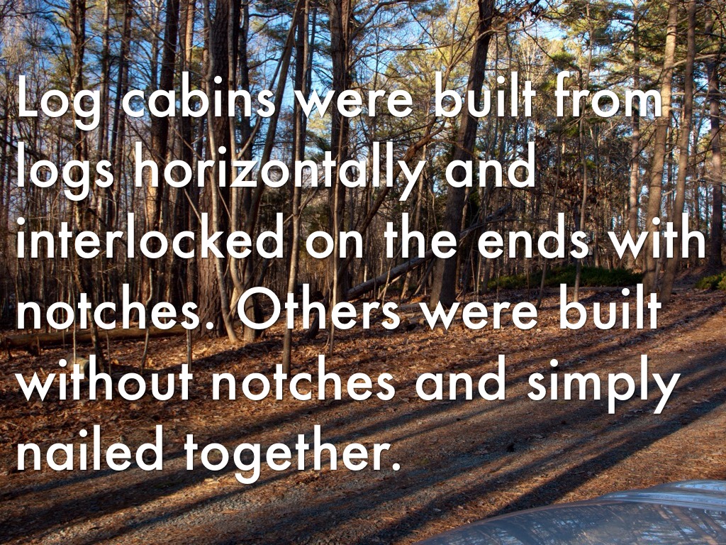 Log cabins were built from logs horizontally and interlocked on the ends with notches. Others were built without notches and simply nailed together.