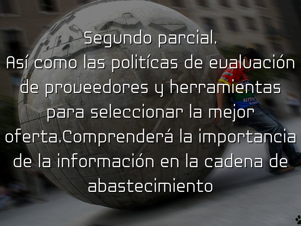 Segundo parcial. Así como las politícas de evaluación de proveedores y herramientas para seleccionar la mejor oferta.Comprenderá la importancia de la información en la cadena de abastecimiento