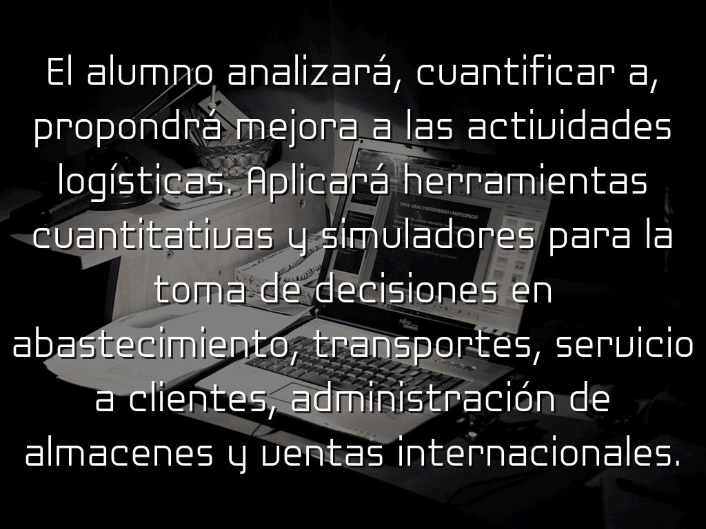 El alumno analizará, cuantificar a, propondrá mejora a las actividades logísticas. Aplicará herramientas cuantitativas y simuladores para la toma de decisiones en abastecimiento, transportes, servicio a clientes, administración de almacenes y ventas internacionales.