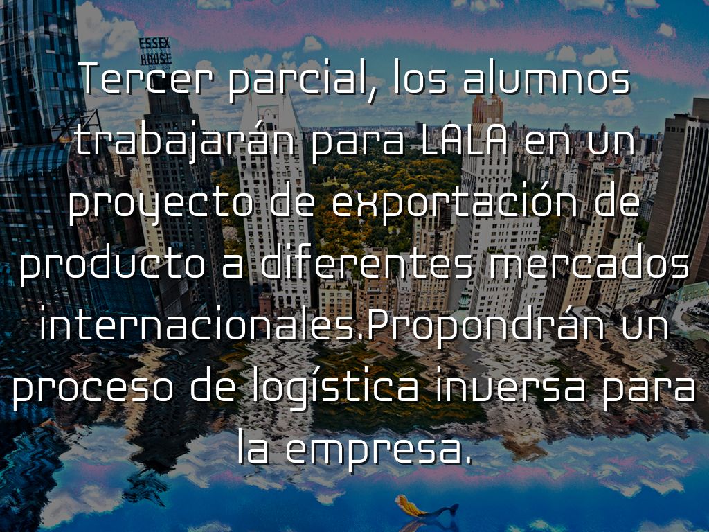 Tercer parcial, los alumnos trabajarán para LALA en un proyecto de exportación de producto a diferentes mercados internacionales.Propondrán un proceso de logística inversa para la empresa.