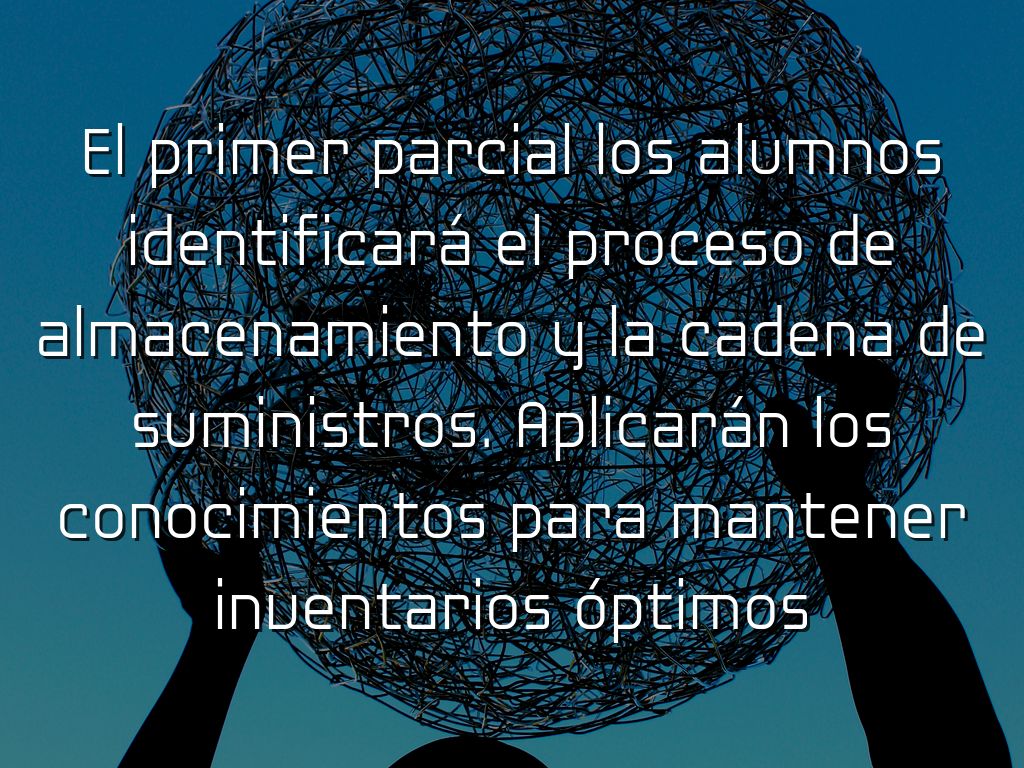 El primer parcial los alumnos identificará el proceso de almacenamiento y la cadena de suministros. Aplicarán los conocimientos para mantener inventarios óptimos