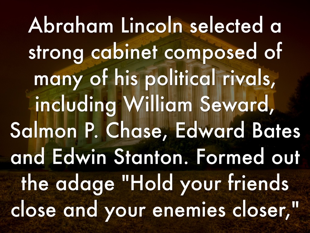 Abraham Lincoln selected a strong cabinet composed of many of his political rivals, including William Seward, Salmon P. Chase, Edward Bates and Edwin Stanton. Formed out the adage "Hold your friends close and your enemies closer,"
