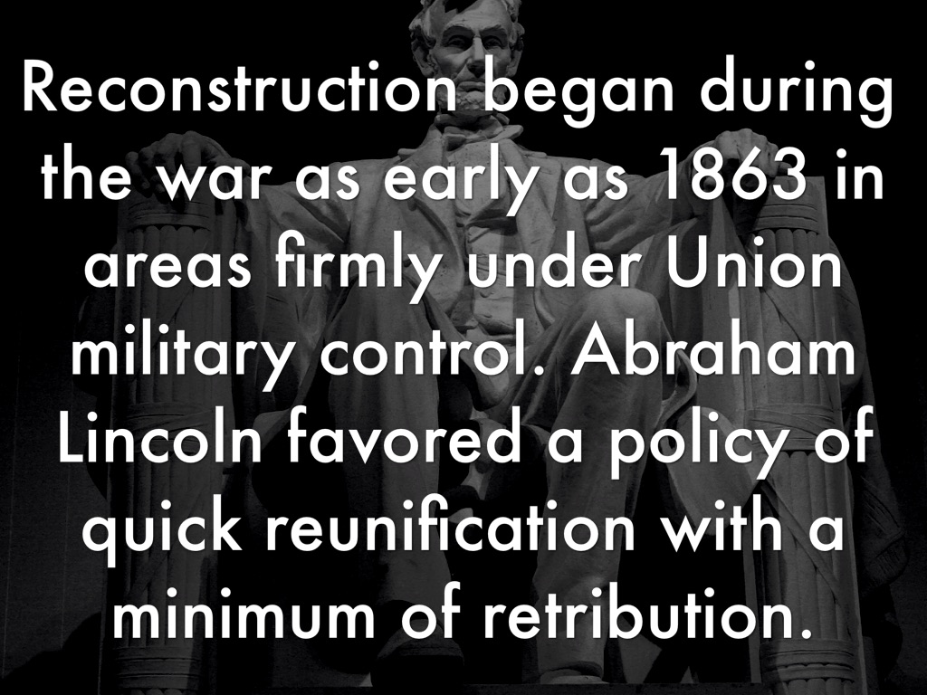 Reconstruction began during the war as early as 1863 in areas firmly under Union military control. Abraham Lincoln favored a policy of quick reunification with a minimum of retribution.