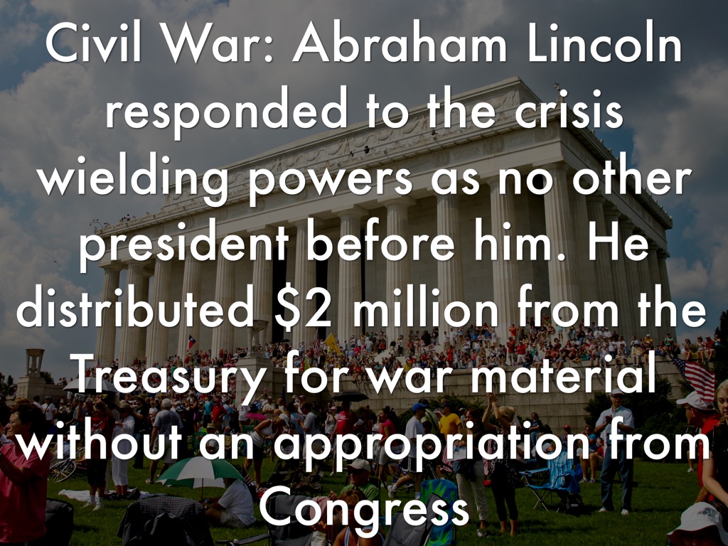 Civil War: Abraham Lincoln responded to the crisis wielding powers as no other president before him. He distributed $2 million from the Treasury for war material without an appropriation from Congress