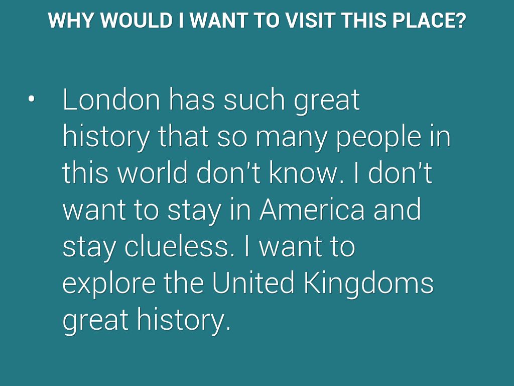 • London has such great history that so many people in this world don't know. I don't want to stay in America and stay clueless. I want to explore the United Kingdoms great history.