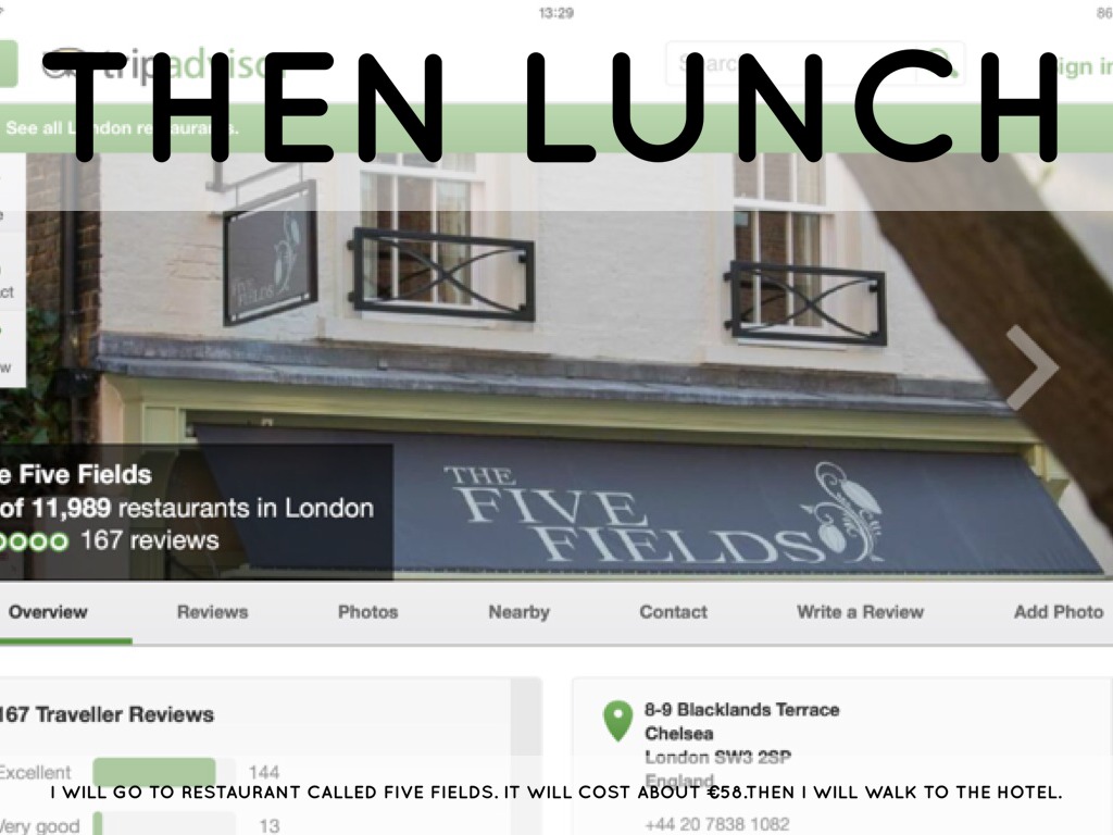 I WILL GO TO RESTAURANT CALLED FIVE FIELDS. IT WILL COST ABOUT €58.Then I will walk to the hotel.