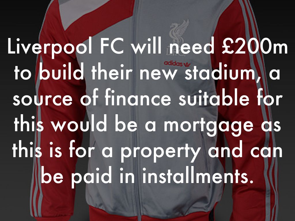 Liverpool FC will need £200m to build their new stadium, a source of finance suitable for this would be a mortgage as this is for a property and can be paid in installments.