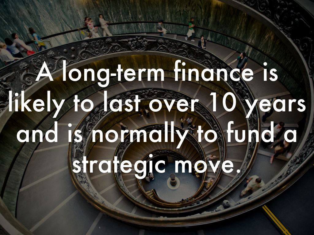 A long-term finance is likely to last over 10 years and is normally to fund a strategic move.