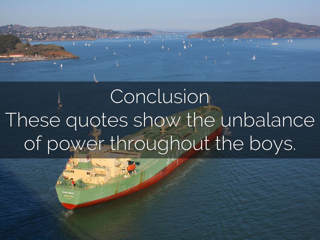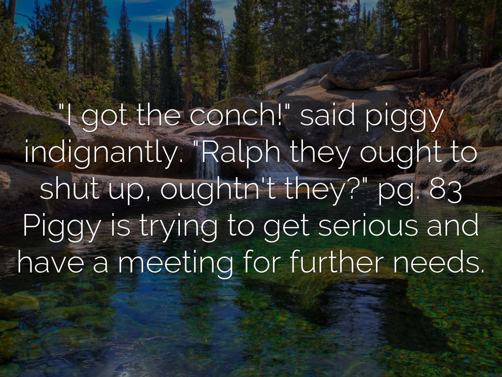 "I got the conch!" said piggy indignantly. "Ralph they ought to shut up, oughtn't they?" pg. 83 Piggy is trying to get serious and have a meeting for further needs.