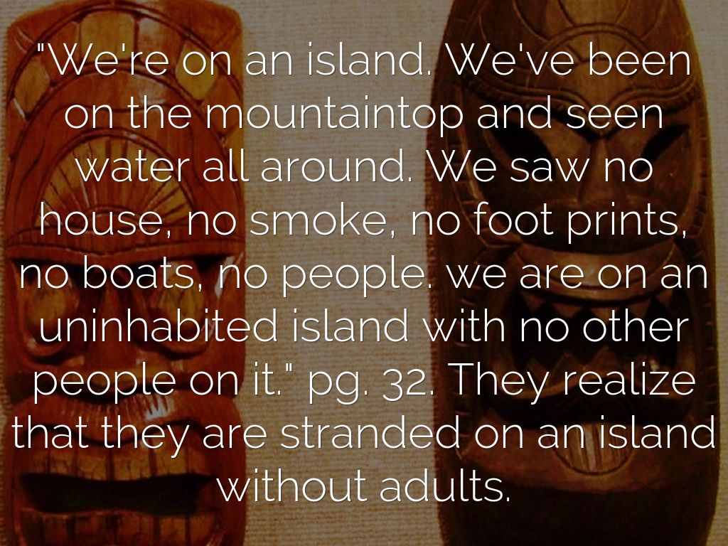 "We're on an island. We've been on the mountaintop and seen water all around. We saw no house, no smoke, no foot prints, no boats, no people. we are on an uninhabited island with no other people on it." pg. 32. They realize that they are stranded on an island without adults.