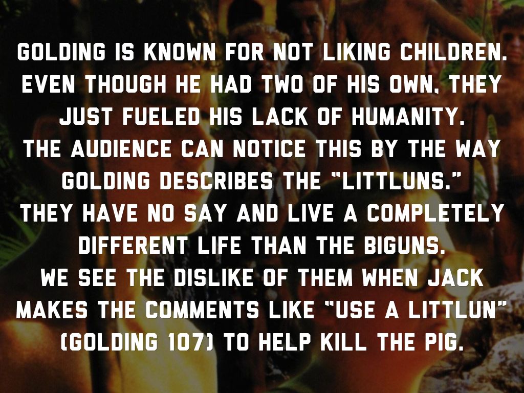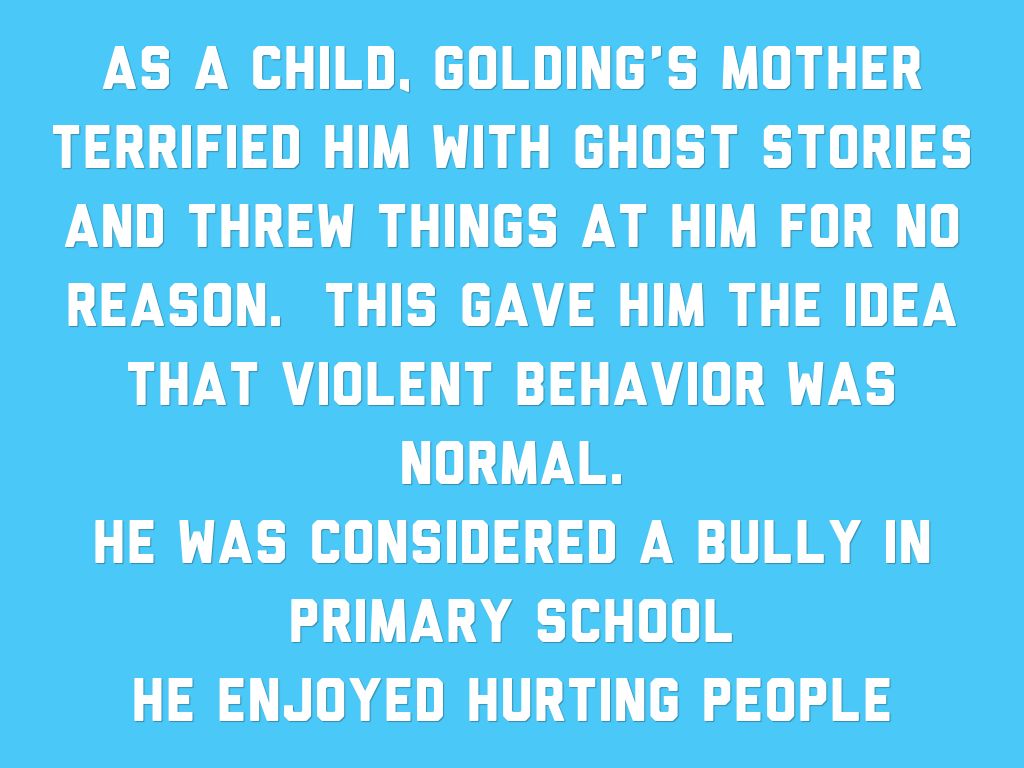 As a child, Golding’s mother terrified him with Ghost stories and threw things at him for no reason. This gave him the idea that violent behavior was normal.