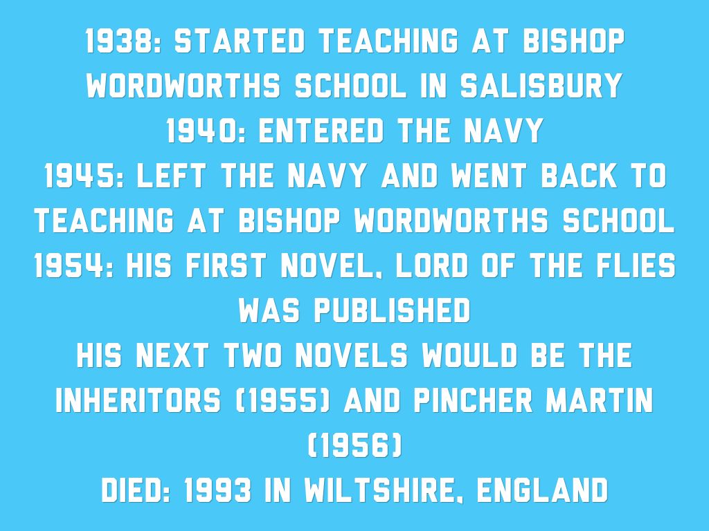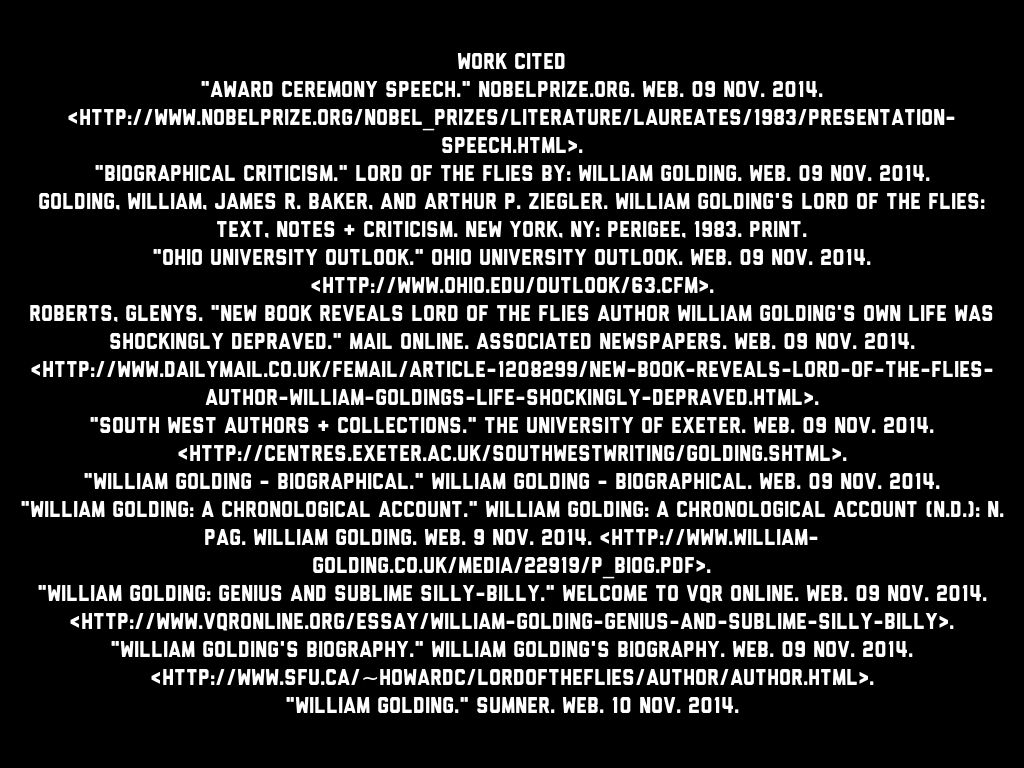 "William Golding: A Chronological Account." William Golding: A Chronological Account (n.d.): n. pag. William Golding. Web. 9 Nov. 2014. .