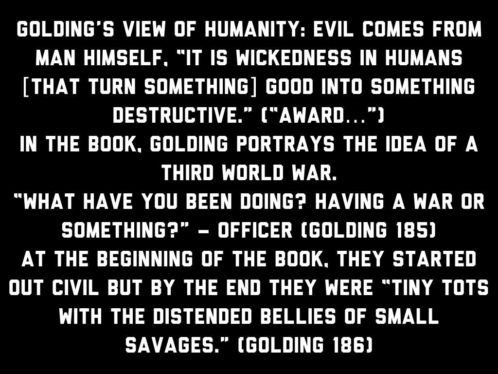 Golding’s view of humanity: Evil comes from man himself, “it is wickedness in humans [that turn something] good into something destructive.” (“Award…”)