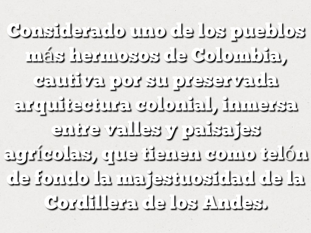 Considerado uno de los pueblos más hermosos de Colombia, cautiva por su preservada arquitectura colonial, inmersa entre valles y paisajes agrícolas, que tienen como telón de fondo la majestuosidad de la Cordillera de los Andes.