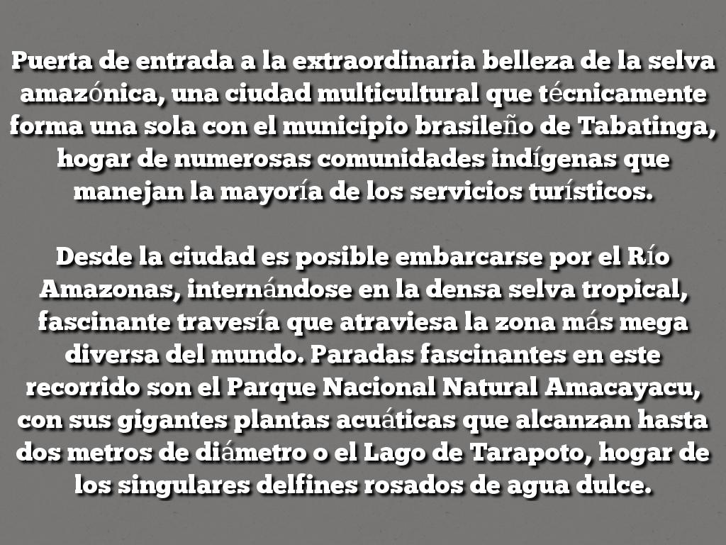 Puerta de entrada a la extraordinaria belleza de la selva amazónica, una ciudad multicultural que técnicamente forma una sola con el municipio brasileño de Tabatinga, hogar de numerosas comunidades indígenas que manejan la mayoría de los servicios turísticos.