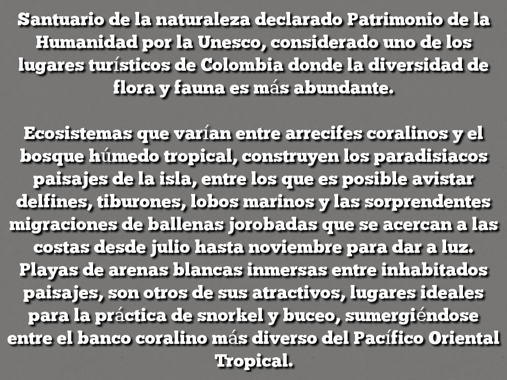 Ecosistemas que varían entre arrecifes coralinos y el bosque húmedo tropical, construyen los paradisiacos paisajes de la isla, entre los que es posible avistar delfines, tiburones, lobos marinos y las sorprendentes migraciones de ballenas jorobadas que se acercan a las costas desde julio hasta noviembre para dar a luz. Playas de arenas blancas inmersas entre inhabitados paisajes, son otros de sus atractivos, lugares ideales para la práctica de snorkel y buceo, sumergiéndose entre el banco coralino más diverso del Pacífico Oriental Tropical.