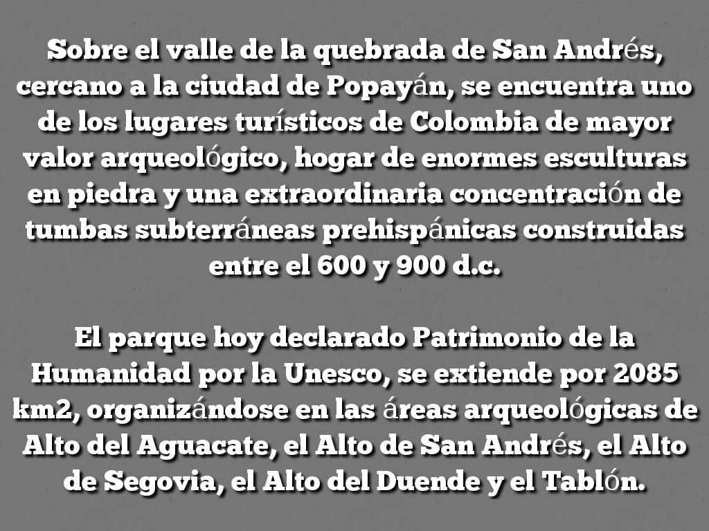 Sobre el valle de la quebrada de San Andrés, cercano a la ciudad de Popayán, se encuentra uno de los lugares turísticos de Colombia de mayor valor arqueológico, hogar de enormes esculturas en piedra y una extraordinaria concentración de tumbas subterráneas prehispánicas construidas entre el 600 y 900 d.c.