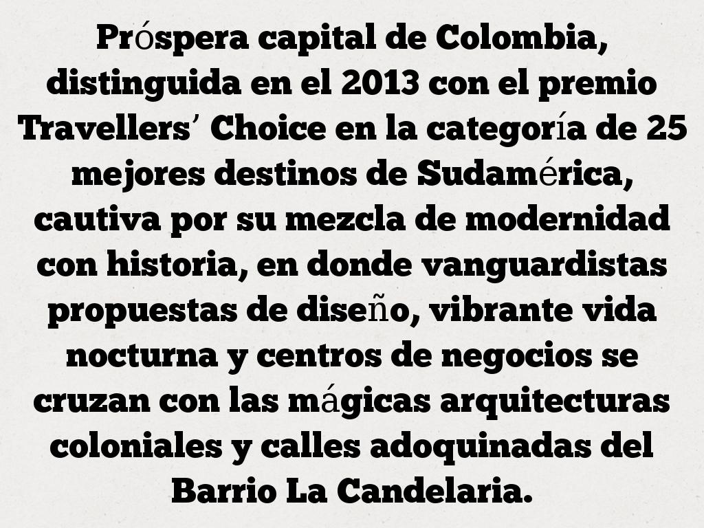 Próspera capital de Colombia, distinguida en el 2013 con el premio Travellers’ Choice en la categoría de 25 mejores destinos de Sudamérica, cautiva por su mezcla de modernidad con historia, en donde vanguardistas propuestas de diseño, vibrante vida nocturna y centros de negocios se cruzan con las mágicas arquitecturas coloniales y calles adoquinadas del Barrio La Candelaria.