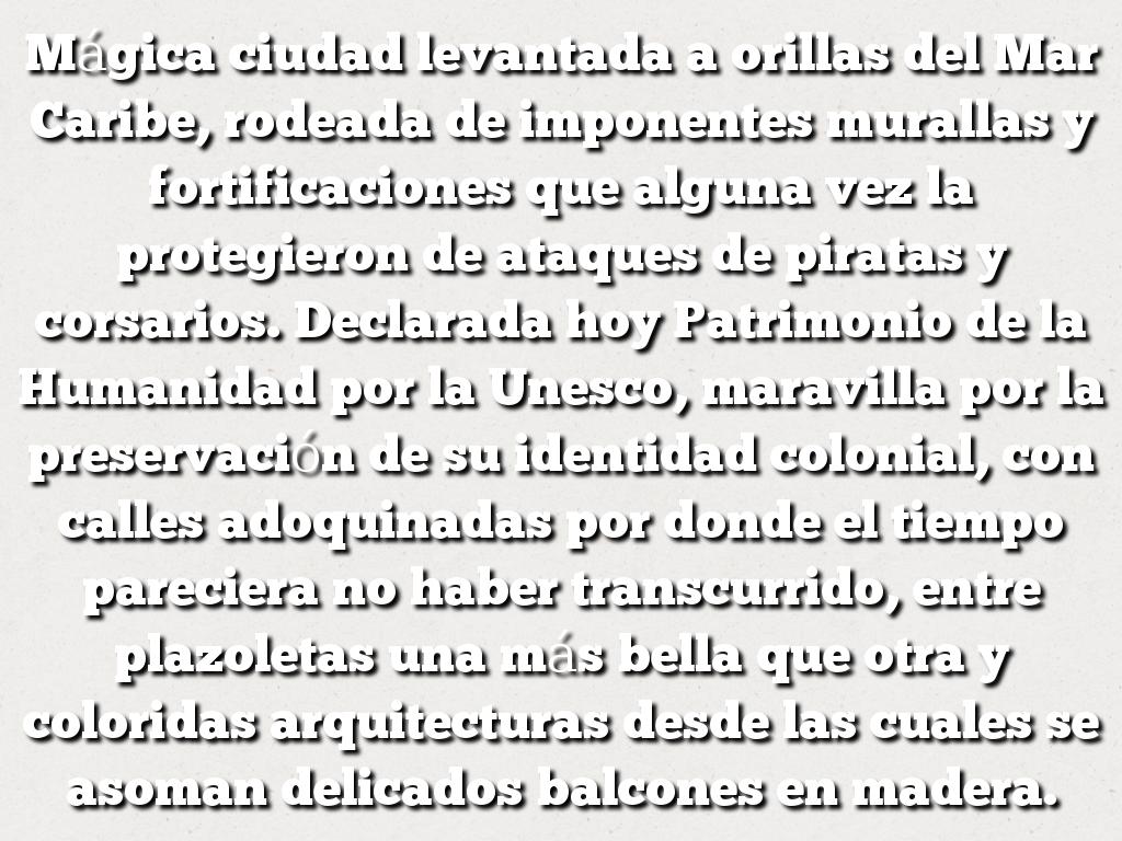 Mágica ciudad levantada a orillas del Mar Caribe, rodeada de imponentes murallas y fortificaciones que alguna vez la protegieron de ataques de piratas y corsarios. Declarada hoy Patrimonio de la Humanidad por la Unesco, maravilla por la preservación de su identidad colonial, con calles adoquinadas por donde el tiempo pareciera no haber transcurrido, entre plazoletas una más bella que otra y coloridas arquitecturas desde las cuales se asoman delicados balcones en madera.