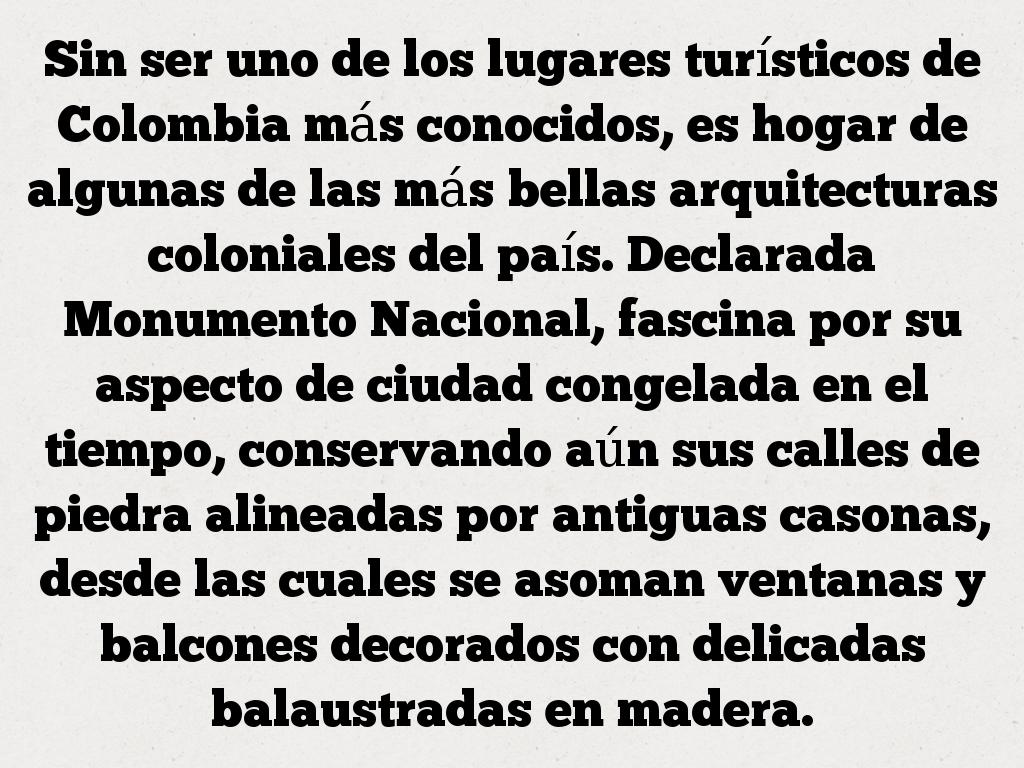 Sin ser uno de los lugares turísticos de Colombia más conocidos, es hogar de algunas de las más bellas arquitecturas coloniales del país. Declarada Monumento Nacional, fascina por su aspecto de ciudad congelada en el tiempo, conservando aún sus calles de piedra alineadas por antiguas casonas, desde las cuales se asoman ventanas y balcones decorados con delicadas balaustradas en madera.
