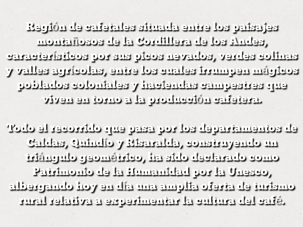 Región de cafetales situada entre los paisajes montañosos de la Cordillera de los Andes, característicos por sus picos nevados, verdes colinas y valles agrícolas, entre los cuales irrumpen mágicos poblados coloniales y haciendas campestres que viven en torno a la producción cafetera.