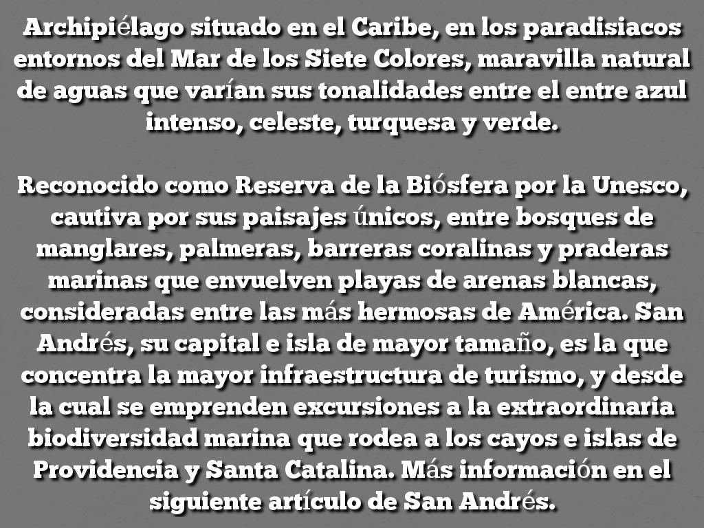 Reconocido como Reserva de la Biósfera por la Unesco, cautiva por sus paisajes únicos, entre bosques de manglares, palmeras, barreras coralinas y praderas marinas que envuelven playas de arenas blancas, consideradas entre las más hermosas de América. San Andrés, su capital e isla de mayor tamaño, es la que concentra la mayor infraestructura de turismo, y desde la cual se emprenden excursiones a la extraordinaria biodiversidad marina que rodea a los cayos e islas de Providencia y Santa Catalina. Más información en el siguiente artículo de San Andrés.