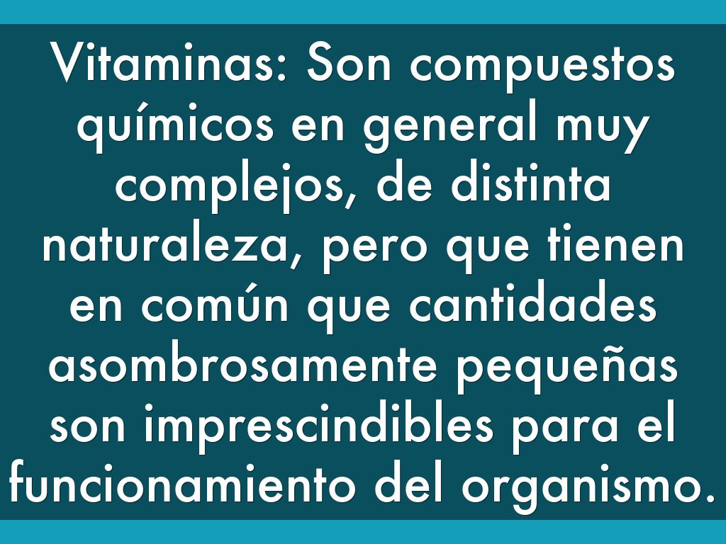 Vitaminas: Son compuestos químicos en general muy complejos, de distinta naturaleza, pero que tienen en común que cantidades asombrosamente pequeñas son imprescindibles para el funcionamiento del organismo.