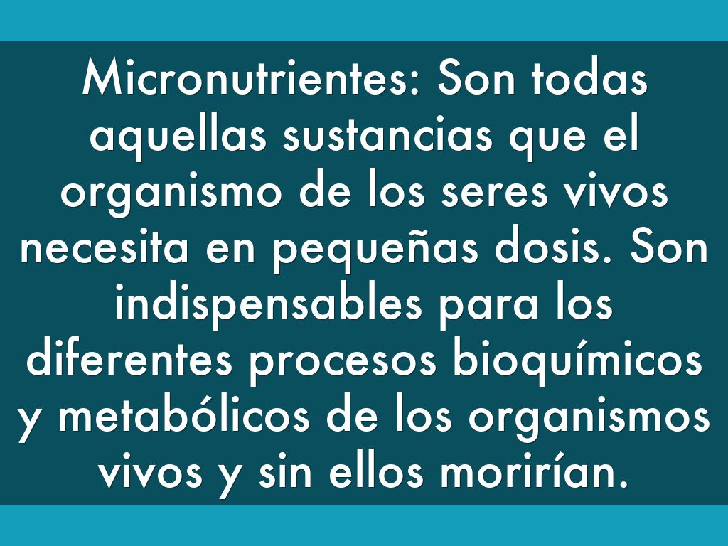 Micronutrientes: Son todas aquellas sustancias que el organismo de los seres vivos necesita en pequeñas dosis. Son indispensables para los diferentes procesos bioquímicos y metabólicos de los organismos vivos y sin ellos morirían.