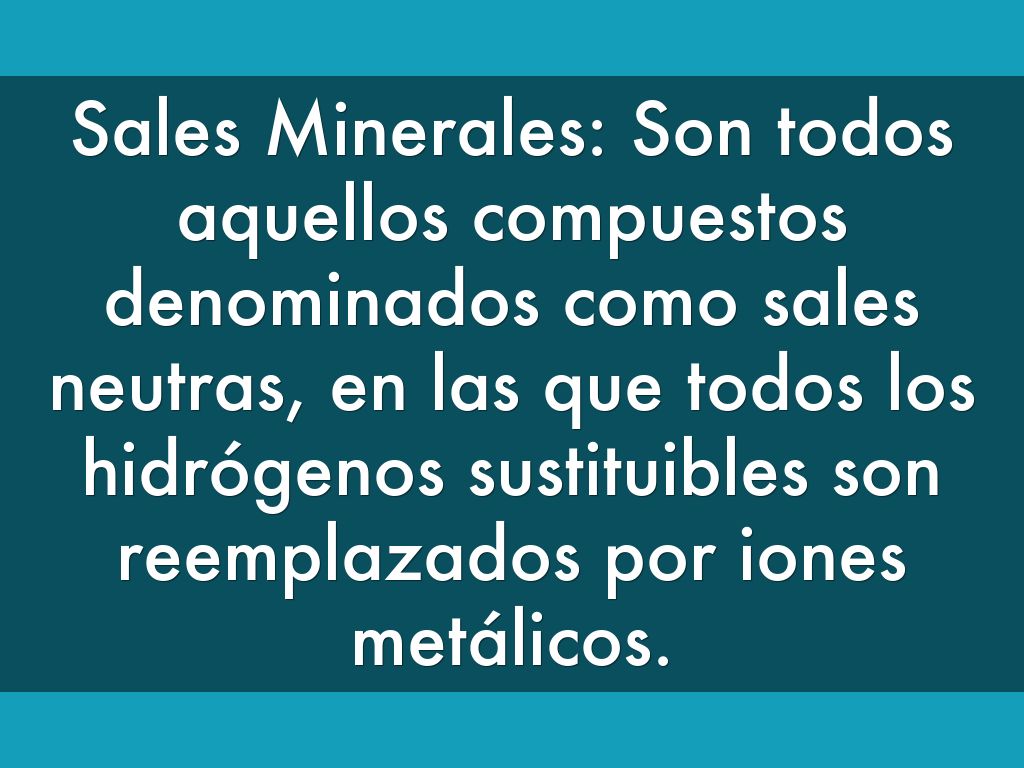 Sales Minerales: Son todos aquellos compuestos denominados como sales neutras, en las que todos los hidrógenos sustituibles son reemplazados por iones metálicos.