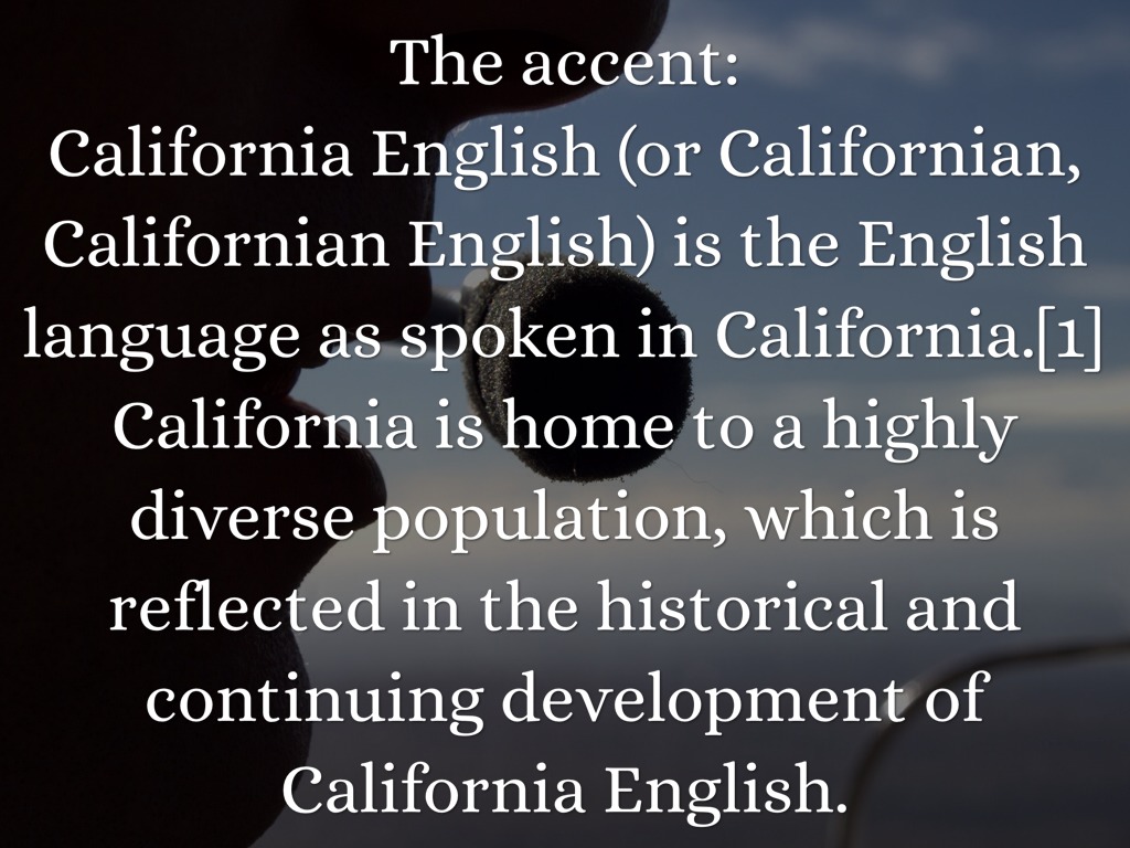 California English (or Californian, Californian English) is the English language as spoken in California.[1] California is home to a highly diverse population, which is reflected in the historical and continuing development of California English.
