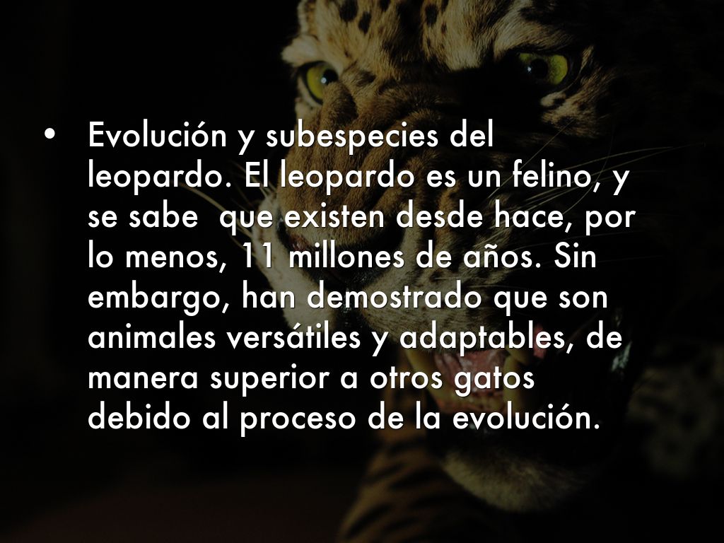 Evolución y subespecies del leopardo. El leopardo es un felino, y se sabe que existen desde hace, por lo menos, 11 millones de años. Sin embargo, han demostrado que son animales versátiles y adaptables, de manera superior a otros gatos debido al proceso de la evolución.