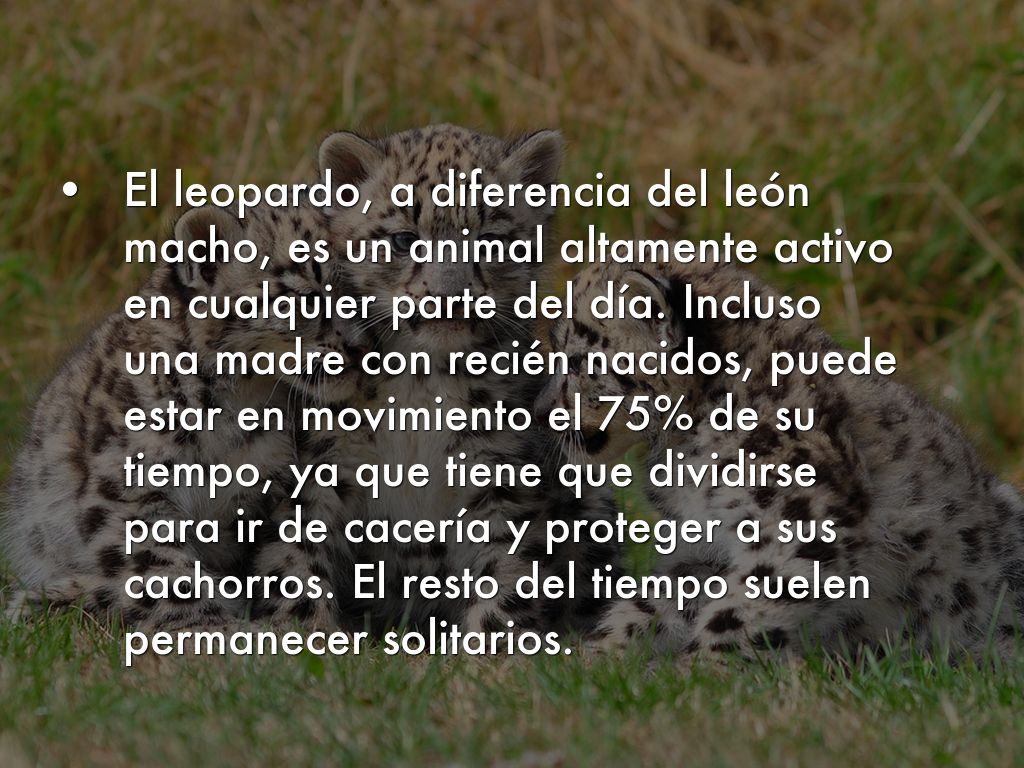 El leopardo, a diferencia del león macho, es un animal altamente activo en cualquier parte del día. Incluso una madre con recién nacidos, puede estar en movimiento el 75% de su tiempo, ya que tiene que dividirse para ir de cacería y proteger a sus cachorros. El resto del tiempo suelen permanecer solitarios.