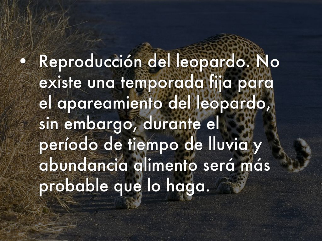 Reproducción del leopardo. No existe una temporada fija para el apareamiento del leopardo, sin embargo, durante el período de tiempo de lluvia y abundancia alimento será más probable que lo haga.