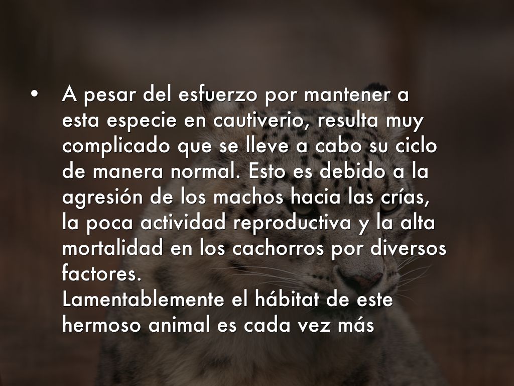A pesar del esfuerzo por mantener a esta especie en cautiverio, resulta muy complicado que se lleve a cabo su ciclo de manera normal. Esto es debido a la agresión de los machos hacia las crías, la poca actividad reproductiva y la alta mortalidad en los cachorros por diversos factores.