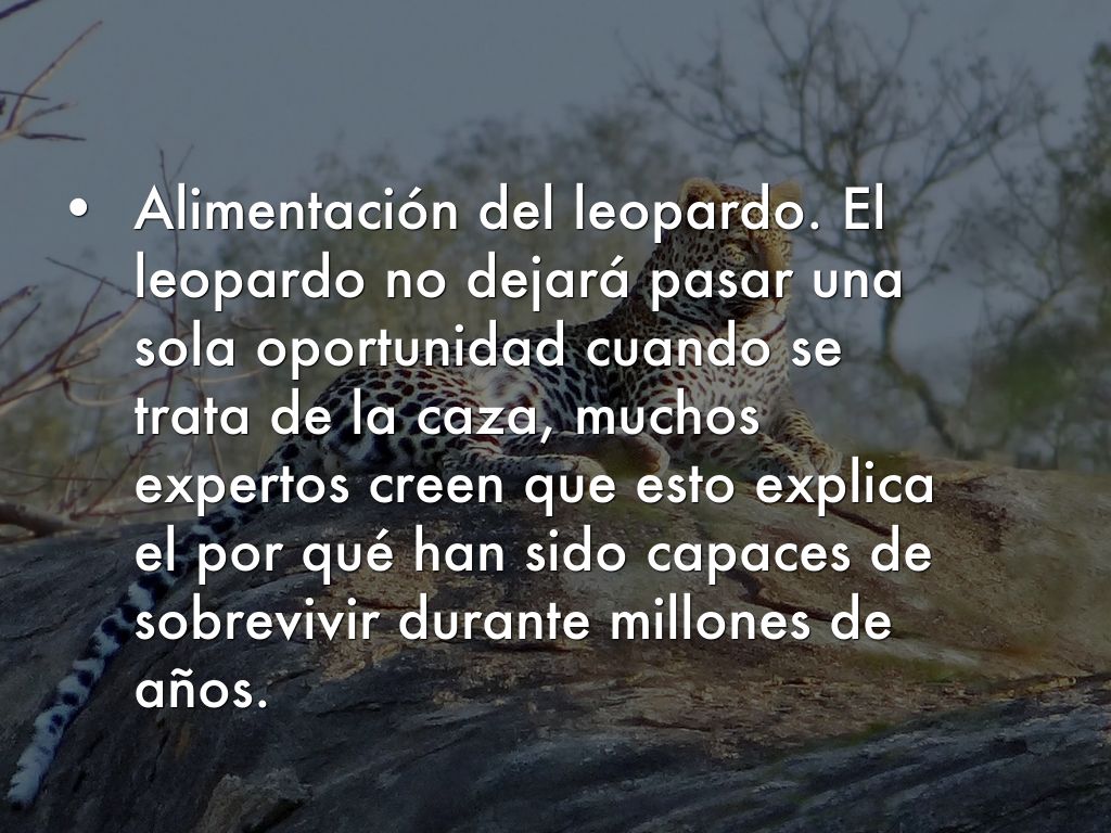 Alimentación del leopardo. El leopardo no dejará pasar una sola oportunidad cuando se trata de la caza, muchos expertos creen que esto explica el por qué han sido capaces de sobrevivir durante millones de años.