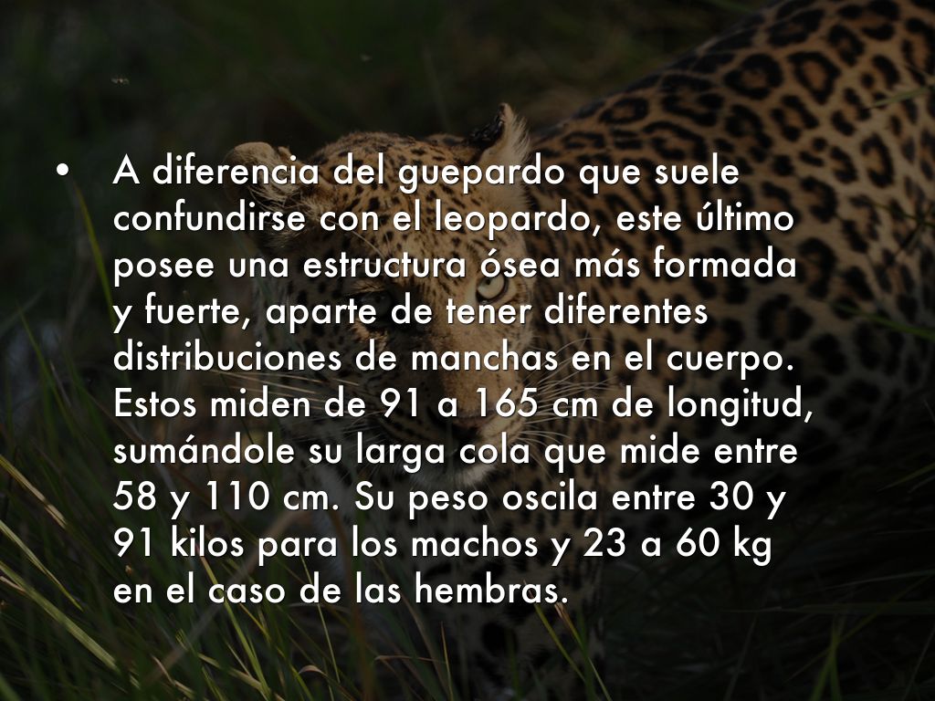 A diferencia del guepardo que suele confundirse con el leopardo, este último posee una estructura ósea más formada y fuerte, aparte de tener diferentes distribuciones de manchas en el cuerpo. Estos miden de 91 a 165 cm de longitud, sumándole su larga cola que mide entre 58 y 110 cm. Su peso oscila entre 30 y 91 kilos para los machos y 23 a 60 kg en el caso de las hembras.